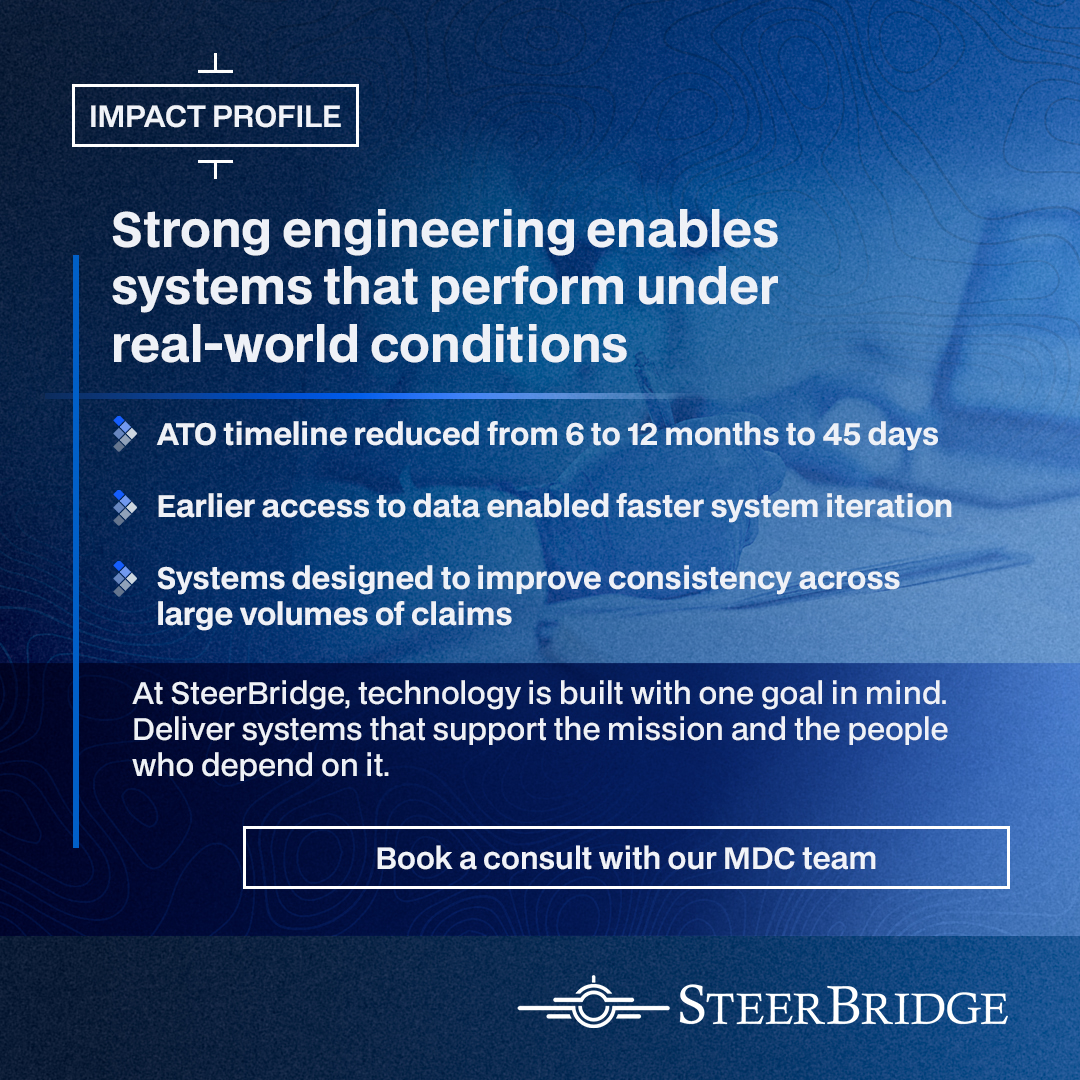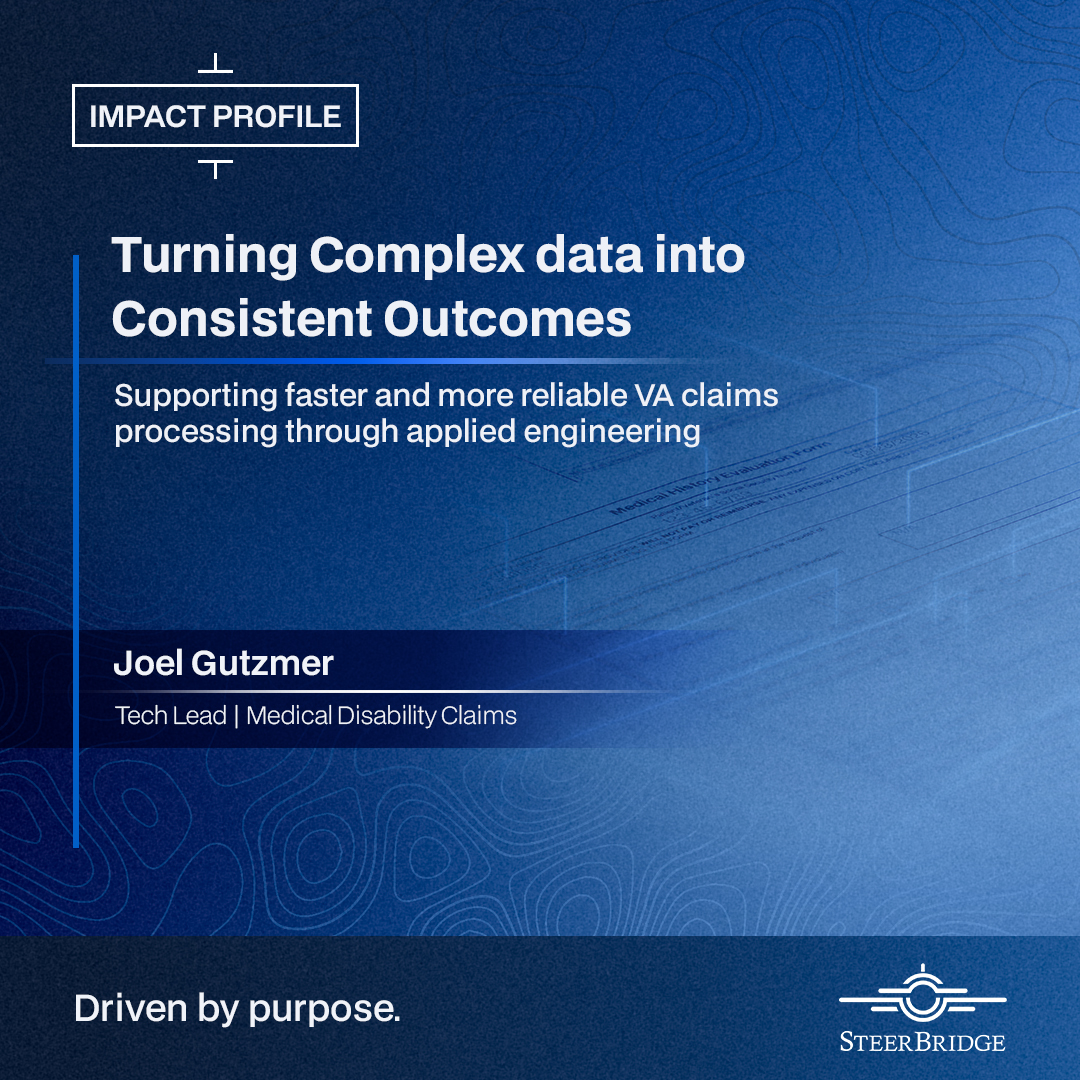 For Joel Gutzmer, Tech Lead on the Medical Disability Claims project at SteerBridge, this challenge is central to his work supporting medical disability claims evaluations in federal environments.